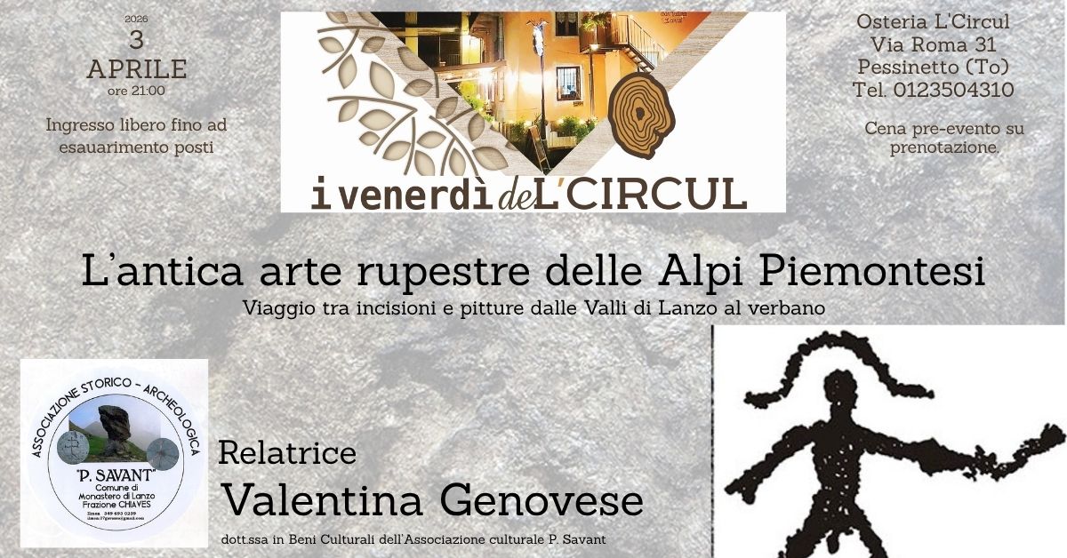 L'Associazione culturale P. Savant propone un viaggio tra le Alpi del Piemonte in cui, partendo dalle nostre Valli di Lanzo e poi, attraversando altre vallate piemontesi, la provincia di Cuneo e infine il territorio del VCO, si esploreranno alcune tra le più misteriose tracce del passato indagate dall'archeologia: le incisioni e le pitture rupestri; segni e figure che i monti della nostra regione custodiscono da millenni.